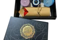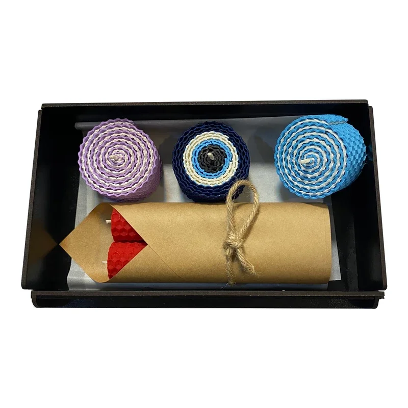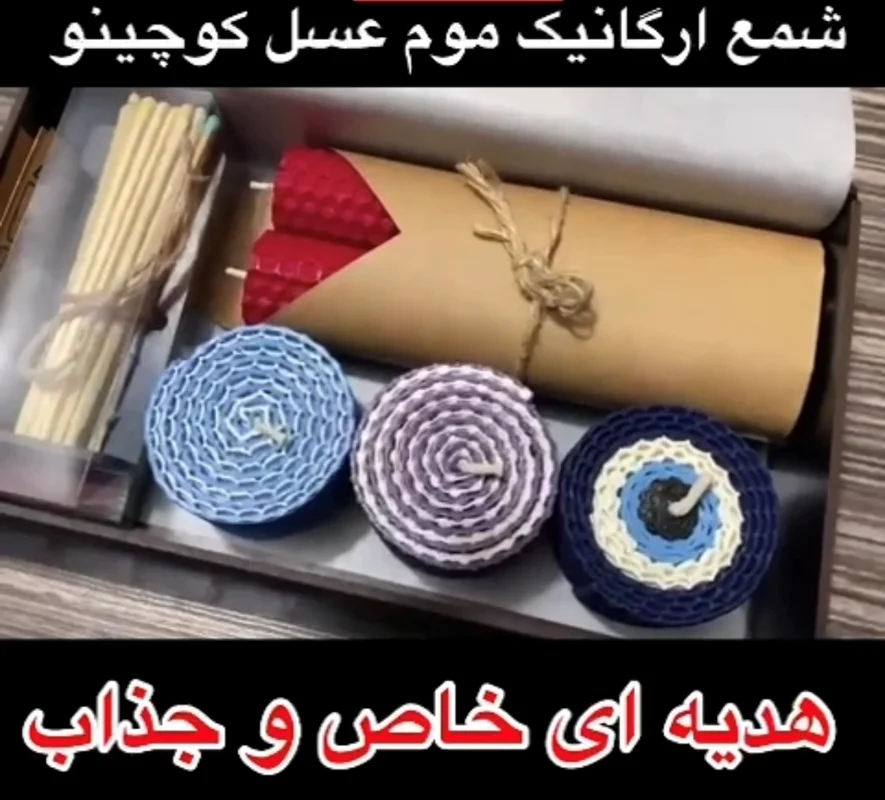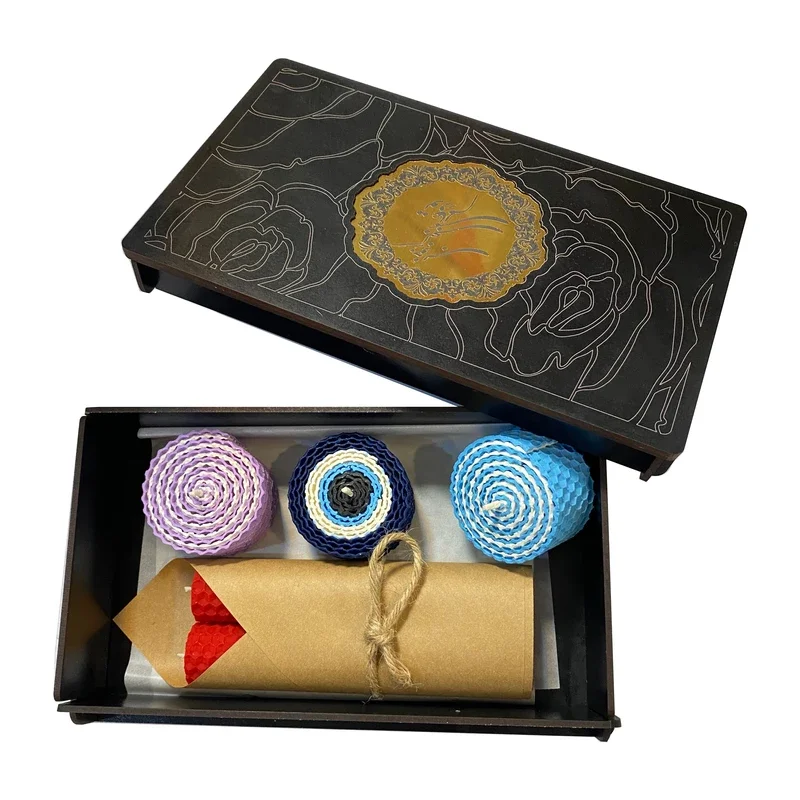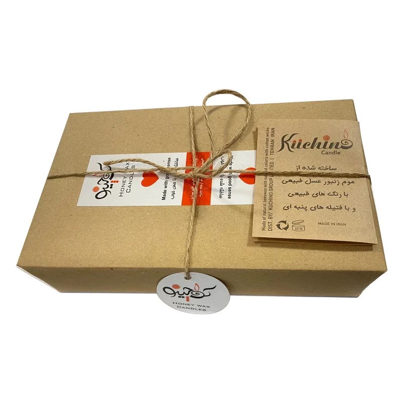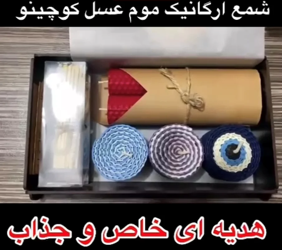 ست هدیه اختصاصی کوچینو با شمع های طرح رولتی و شمع چشم و نظر شبیه تصویر به همراه کبریت تزئینی هدیه به صورت پیش فرض آماده است . ولی شما بدون هیچ هزینه اضافی و با قابلیت انتخاب سلیقه ای میتوانید شمع ها و حک روی پلاک طلایی اختصاصی را شخصی سازی کنید . (هر متنی که مدنظر شما است) این پک هدیه جذاب میتواند در مناسبت های مختلف به عنوان هدیه ای زیبا برای مخاطبین شما و یا پک هدیه تبلیغاتی منحصربفرد به عنوان هدیه ای خاص توسط شرکت ها و موسسات برای مشتریان و یا همکاران شما باشد . با توجه به جذابیت بسته بندی این محصول و کیفیت شمع های داخل این پک سعی بر آن شده تا هدیه ای منحصر بفرد و در خور و شایسته به عزیزان شما آماده شود . این محصول جایگزینی عالی به جای انواع شکلات های بسته بندی با قیمت های گزاف برای هدیه با قیمت مناسب می باشد . پلاک طلایی زیبا که بر روی درب محصول است به صورت پیش فرض (طرح : داخل تصویر با متن تو در عالم نمیگنجی ز خوبی) است که کاملا قابلیت شخصی سازی دارد . برای حکاکی طرح اختصاصی پلاک طلایی باید بعد از ثبت سفارش این محصول در واتس آپ یا یکی از راه های ارتباطی با ما در تماس باشید.